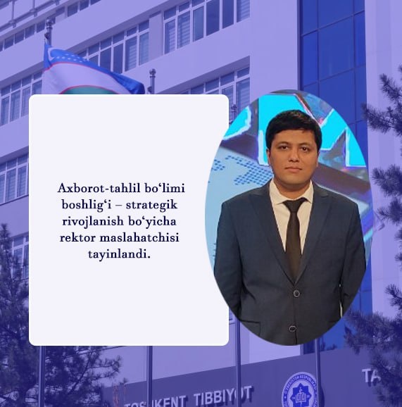 #Tayinlov Toshkent davlat tibbiyot universiteti rektorining buyrug‘iga asosan Axborot-tahlil bo‘limi boshlig‘i lavozimiga Shohinur Boymanovich Mirzayev tayinlandi. ✅Rasmiy sahifalarimiz: Telegram | Facebook | Instagram | YouTube | X | Linkedin