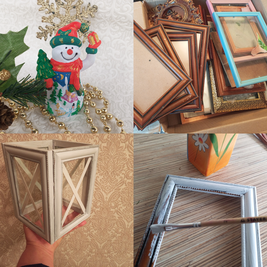 Здравствуйте, друзья! У меня со временем накопилось много фоторамок, в основном это находки. И у меня не было четкого плана, что я с ними буду делать.По прямому назначению использовать не хотелось. Недавно подсмотрела идею, опять же в «Пинтерест». И решила воплотить. Подобрала одинаковые по размеру рамки. Сначала нужно их подготовить, разобрать и снять всё лишнее. Стекла нам еще пригодятся. Крепления тоже снимаем. Теперь рамки покрасим. Можно придать некую потертость.Выделить фактуру. Пока сушатся рамки, займусь вот этим персонажем. Тоже когда - то подобранным. Подсветка давно вышла из строя, поэтому снеговика тоже преобразим. В процессе покраски рисунок на фигурке становится виднее. После просушки раскрашу снеговика. Будет повеселее. А пока вернемся к нашим рамкам. Они достаточно подсохли, и теперь продолжаю с ними работать. Использую просто клеевой пистолет. Сначала вклеиваем стекла. На стекле делаю раскладку из пластиковых полосок. Можно использовать любые прямые палочки. У мен