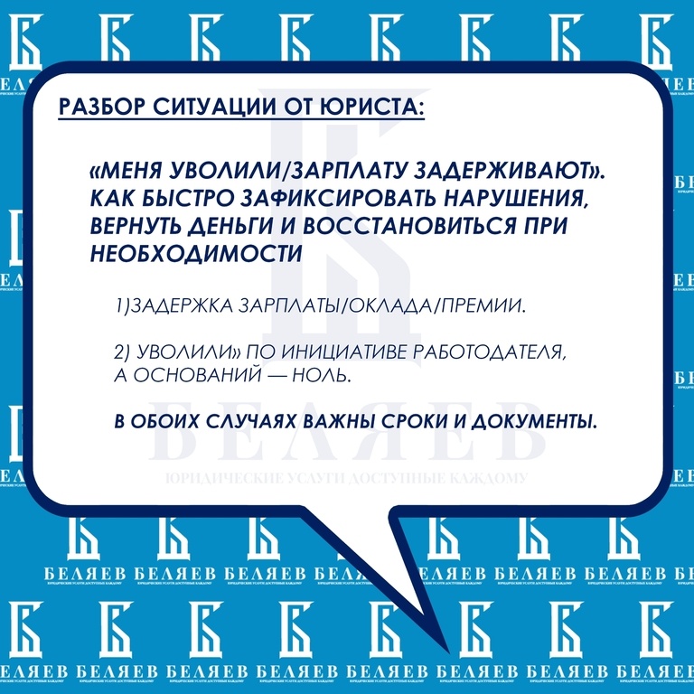 💼 «Меня уволили/зарплату задерживают». Как быстро зафиксировать нарушения, вернуть деньги и восстановиться при необходимости 🟦 Сценарии Задержка зарплаты/оклада/премии. 2) Уволили» по инициативе работодателя, а оснований — ноль. В обоих случаях важны сроки и документы. 1) 🧾 Фиксируем нарушение По зарплате: выписки, расчётки, табели, переписка, график выплат, факт выхода на работу. По увольнению: приказ/запись, служебные записки/переписка, объяснительные (если требовали), доказательства отсутствия проступка. 2) 📨 Требование работодателю Короткое письмо: «Прошу выплатить задолженность по заработной плате за ___ в сумме ___ не позднее ..__. Готов получить любым удобным способом. В противном случае обращусь за защитой прав.» По увольнению: «Прошу отменить приказ №__ от ..__ как незаконный, восстановить меня и выплатить средний заработок за время вынужденного прогула. Готов выйти к ..__» 3) 🧭 Куда жаловаться параллельно Государственная инспекция труда — оперативная проверка,