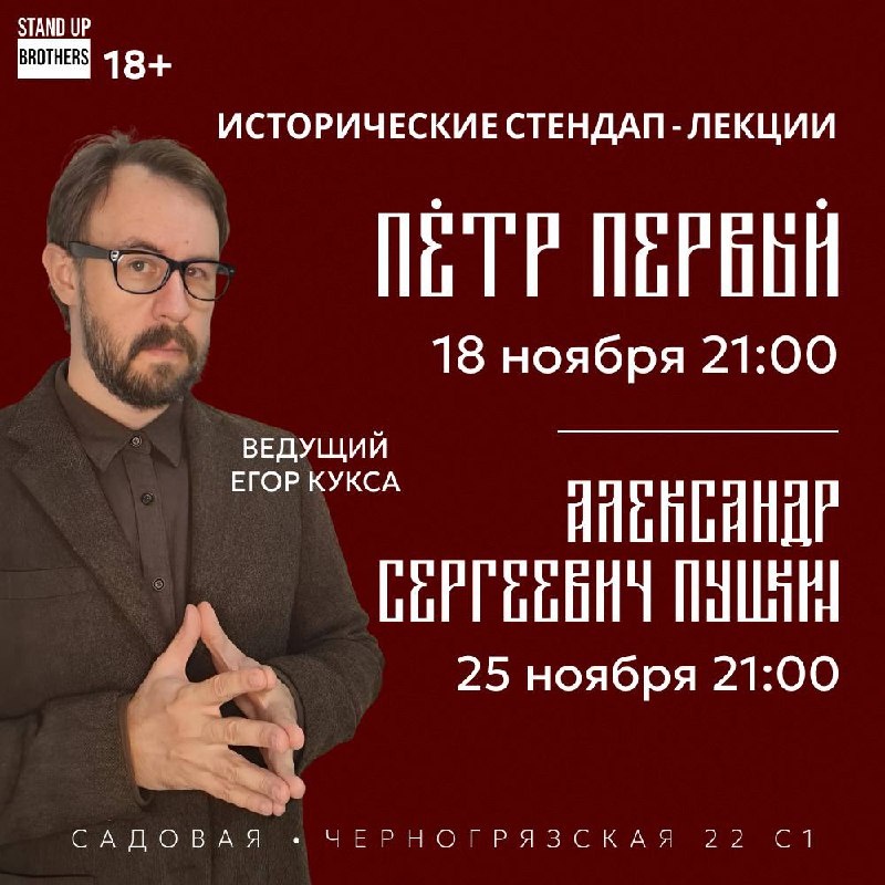 Стендап лекция от Егора Куксы🧐 Хочешь не только смеяться, но и просвещаться? Тогда это то что тебе нужно 18.11|| StandUp лекция «Пётр Первый» Билеты 25.11|| StandUp лекция «Александр Сергеевич Пушкин» Билеты 📍 StandUp Brothers ул. Садовая черногрязская 22с1