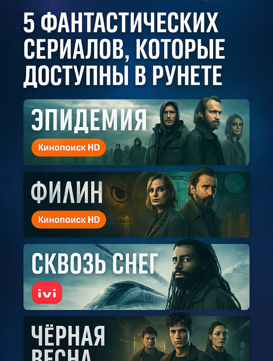 1. Эпидемия (Кинопоиск HD) Россия, недалёкое будущее. Неизвестная болезнь начинает распространяться, и герои пытаются спастись за пределами города. Снят хорошо, без фальши. Отличная актёрская работа и ощущение реальной тревоги. 📍 Где смотреть: Кинопоиск по подписке 2. Филин Детективная история с элементами паранормального. Мрачный визуал, немного нуара, немного фантастики. Подходит для тех, кто любит, когда не всё объясняется напрямую. 📍 Где смотреть: Кинопоиск HD 3. Сквозь снег (Snowpiercer) После климатической катастрофы жизнь продолжается только в гигантском поезде. Но социальные проблемы не исчезли. Каждый сезон держит темп, темы — от философии до чистой драмы. 📍 Где смотреть: Okko, IVI 4. Чёрная весна Российский сериал в духе научного триллера. Не супербюджет, но есть идея, и она работает. Смотрится на одном дыхании — в финале есть что обсудить. 📍 Где смотреть: IVI 5. Экспансия (The Expanse) Один из лучших космических сериалов последних лет. Много политики, напря