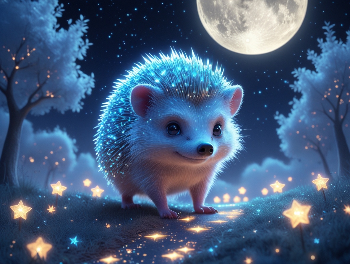 В далёком уголке вселенной, где серебристые кометы прячутся в пушистых облаках космической пыли, существовало тихое и очень необычное место — Лунный лес. Его деревья светились мягким голубым светом, а листья звенели при каждом дуновении ветра, будто маленькие колокольчики. В этом лесу жило много удивительных существ, но самым необычным из них был маленький Лунный Ёжик по имени Флик. Флик отличался от всех ежей тем, что его иголки сияли как звездочки. Каждую ночь они переливались голубым и серебристым светом, и если кто-то случайно заблудился в лесу, Флик мог осветить путь своим сиянием. Но сам он был очень робким и почти не выходил за пределы своей норки у подножия Большого Лунного Дерева. Однажды ночью Лунный лес затих. Деревья перестали звенеть, свет немного померк, и даже звёзды будто бы дышали медленнее. Великая Луна — хранительница леса — не поднялась на своё место. На небе висел только тусклый круг, будто её кто-то спрятал за прозрачную вуаль. Жители Лунного леса собрались на По