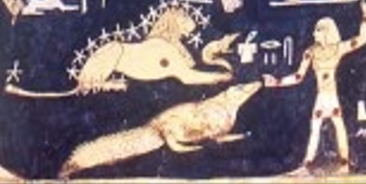 Доброго всем времени. Продолжим увлекательное чтение надписей на забо расшифровку части потолочной росписи в гробнице Сети I. Начало здесь: Закончим с центральной частью изображения. Остановились мы вот на этом фрагменте: С изображением льва разобрались. Остались изображения земноводного и человека с поднятой вверх рукой. Человек идёт к рептилии и протягивает ей руку. Возможно это означает союз, либо подчинение, либо генетический контакт. Если смотреть на контекст всей картинки, то именно о геноме и идет речь. Далее, как уже рассматривали, значок, условно, "воздействие и вибрация" и результат - голова сокола и тело человека - человек разумный, вертикальная ось системы, движение - вверх. При чем голова, "разум", принадлежит левой координатной полуплоскости, а тело - правой половине. Если левая часть всего изображения символизирует долю внешнего генома и операции с ним, то правая - это про родительский геном планеты. Разберём, что тут. Слева направо. Мужская фигура с чем-то в руках, во
