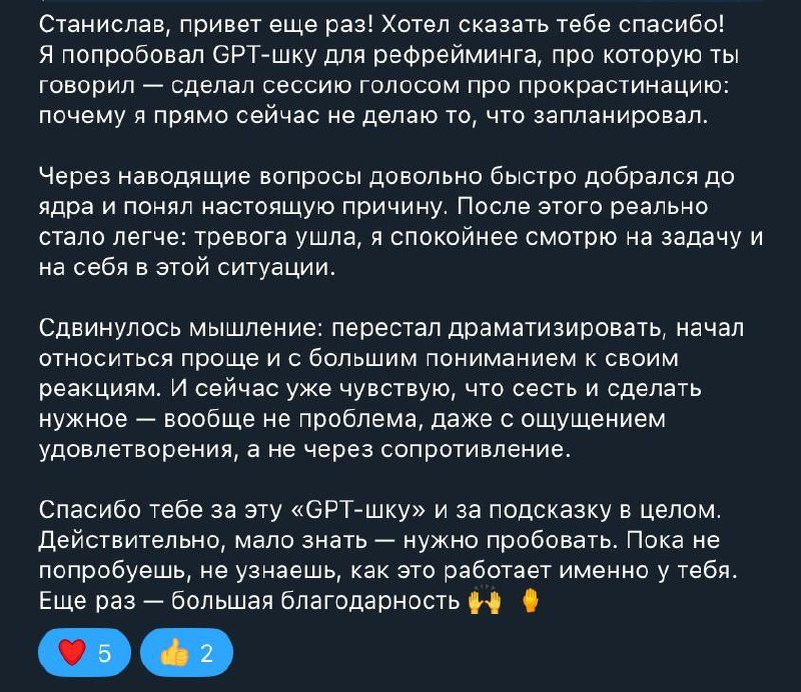 🚨 Не используйте ИИ «как психолога», пока не прочитаете это ИИ может быть гениальным инструментом для роста с которым вас не остановить, но есть состояния, при которых он реально опасен. ❌ Когда ИИ НЕ подходит Опасность возникает, если человек находится в состояниях, где требуется глубокая психотерапия(-иатрия): • суицидальные мысли • ПТСР, флэшбеки, панические атаки • тяжёлая депрессия и потеря самосохранения • бредовые идеи, мания, искажение реальности • диссоциации, расщепление, сильные эмоциональные штормы В этих состояниях ИИ не видит выражение лица и тела, не считывает риски и может случайно усилить состояние, просто ведя «нейтральный диалог» или поддакивая. 🟢 Когда ИИ — это пушка бомба Для всех остальных ИИ — революция. Он идеально помогает там, где задействованы методы 1–3: • самоанализ • разбор эмоций • поиск убеждений • снижение тревоги • понимание паттернов • планирование и действие • формирование здорового мышления ⚡️Почему это так важно? Потому что сегодня узкое