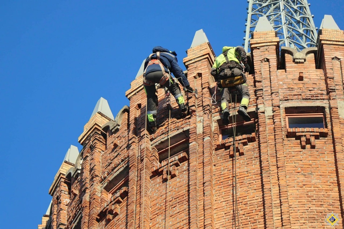 🚧 На водонапорной башне в Инте противоаварийные работы На такой высоте работы выполняют промышленные альпинисты санкт-петербургской компании, которые уже более пяти лет сотрудничают с предприятиями Инты. Специалисты снимают легко отделяемые части башни.