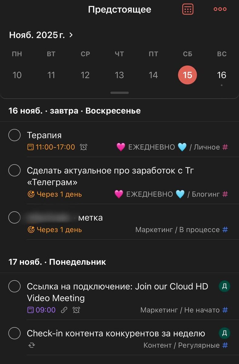 Весь год я планировала свои задачи в заметках😅 Но все вечно терялось: если задача не была выполнена день в день, я могла ее не подвинуть, и она упускалась Теперь благодаря проекту на маркетинг я познакомилась с Todoist и все планирую там Разделила задачи по категориям: • личное • мой Тг • блогинг • вуз • и отдельно задачи компании на контент / маркетинг Личные задачи теперь имеют дедлайн. Можно ставить напоминалки о каждой задаче. Гугл календарь мне тоже уже не нужен, потихоньку отвыкаю от него))) Теперь хочу закрепить еще некоторые привычки в жизни: 👉🏻 Ложиться до 01, вставать до 9:00, уже режим восстанавливается, это приоритет 👉🏻 Анализ недели и планирование новой в вс-пн 👉🏻 Рефлексия состояния в ср-чт по специальным вопросам Но слона едят по кусочкам, поэтому привычки внедряю постепенно, шаг за шагом!) Как вам этот способ планирования? Вы сами что используете? В работе со своей командой я использую пока аналог Notion, там у нас хранятся еще и все материал моего Тг-кана