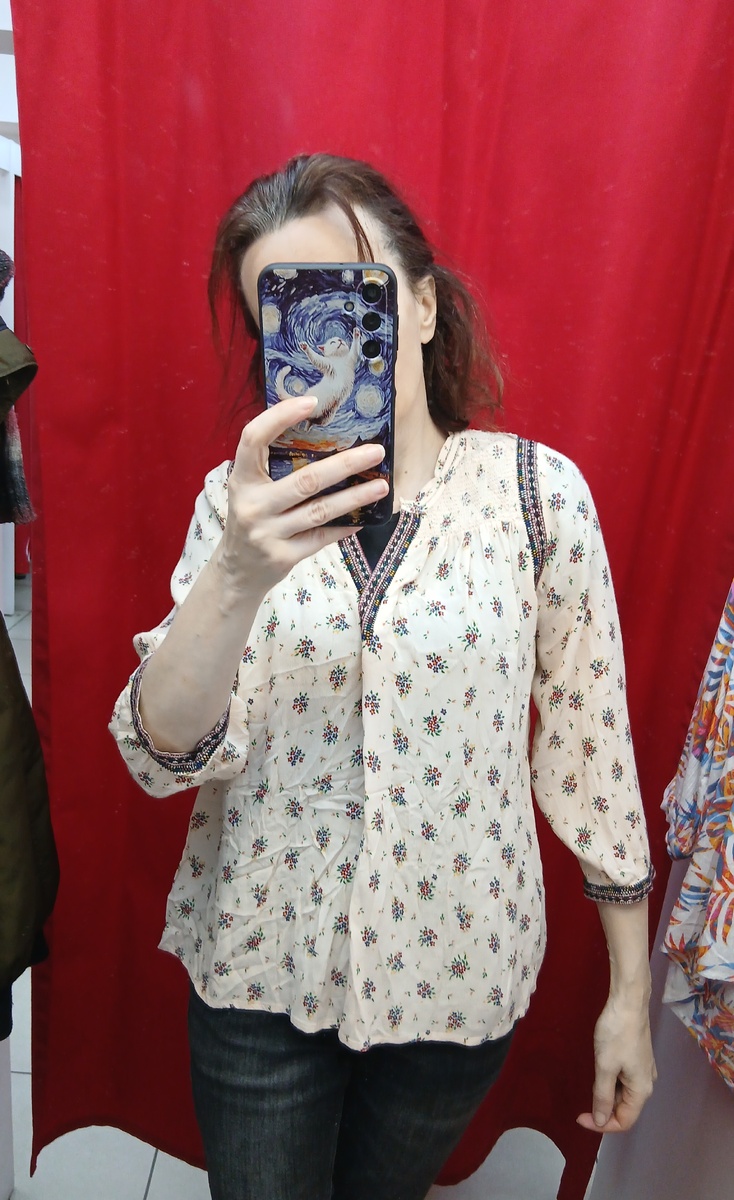 Здравствуйте , как ни печально, но акцию "всё по 100 рублей" я проворонила. Пошла на "всё по 50", но это скорее для галочки, то ли распродажа была плохая, то ли всё ранее выросли, ушла я без покупок. Почти всё увешано платьями и блузками, сезонных вещей уже почти не было. До такой цены всегда остаются кардиганы без застежки и совсем уж старая верхняя одежда. Даже фоток по минимуму. Блузка с рукавами 3/4 и отделкой тесьмой. Вот такие кокетки, буфы образуют рисунок елочку. Вискоза. Ещё одна блузка с такими же рукавами, на груди планка с пуговицами.. Тоже вискоза. Прямое платье померила просто из-за материала. С такими объёмными косами. Ткань толстая жаркая, еще и молния заела, одно расстройство((. И вроде как полнит оно(( Прямое платье с длинными рукавами, ткань полупрозрачная, так что есть подкладка. Туника с короткими рукавами, отрезная под грудью. Вискоза. Прямая длинная юбка с высоким разрезом сбоку. Смесовая ткань. Прямая юбка цвета фуксии. Мне примерно по колено, на средний р