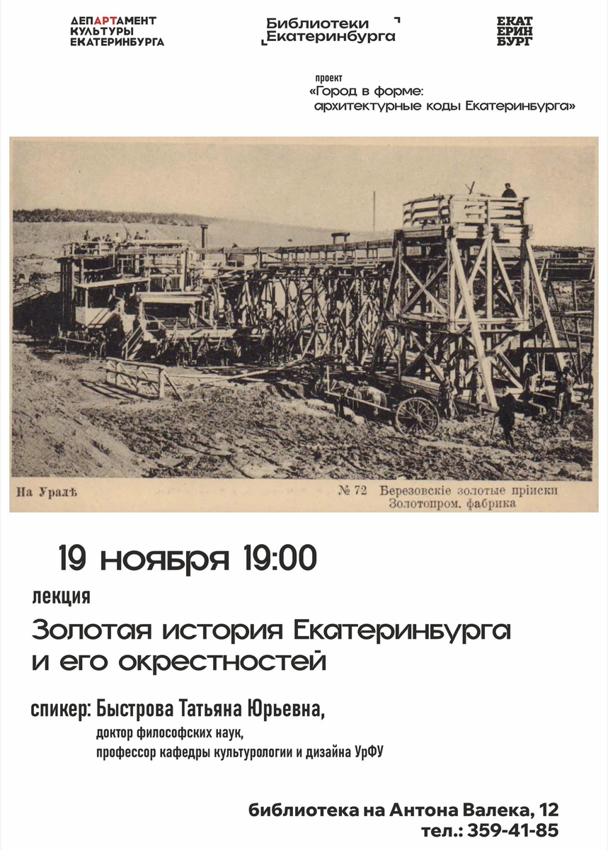 В рамках проекта «Город в форме: архитектурные коды Екатеринбурга» 19 ноября в Библиотеке на Антона Валека, 12 с лекцией «Золотая история Екатеринбурга и его окрестностей» выступит доктор философских наук, профессор кафедры культурологии и дизайна УрФУ Татьяна Юрьевна Быстрова. Именно в окрестностях Екатеринбурга было найдено первое русское золото. Эта находка послужила поводом к первой в мире «золотой лихорадке», оказала влияние на экологию региона и сыграла большую роль в формировании государственного золотого запаса. На встрече вы узнаете: ✔️Чем рассыпное золото отличается от «песошного»? ✔️Почему Алексей Турчанинов наказал своего подчиненного за находку золота? ✔️Какие карты оставил нам аббат Шапп д'Отрош после путешествия по Уралу? ✔️Где мыли золото в центре нынешнего Екатеринбурга? 🗓️ 19 ноября в 19:00 📍 Библиотека на Антона Валека, 12 Участие бесплатное, но обязательно зарегистрируетесь: ekmob.timepad.ru/event/