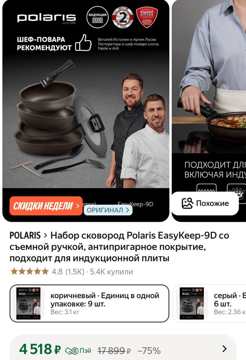 Набор сковород Polaris EasyKeep-9D со съемной ручкой, антипригарное покрытие, подходит для индукционной плиты https://market.yandex.ru/cc/82irJS ииии получаем деньги на карту за отзыв ✨✨ ⭐️NORTME-41-AF - минус 2000₽ на один любой заказа от 8000₽ (для новых пользователей) ⭐️BER103-AF — минус 100₽ на один любой заказ от 5000₽ ✅ Подписаться 🔣 Бот с промокодами