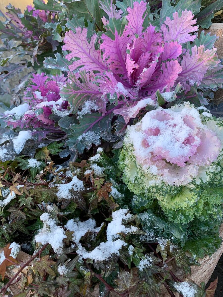 Сегодня в Петербурге выпал снег, а я застала себя за фотографированием клумбы (уже не первый раз за пару месяцев). Это что, старость или тонкое восприятие красоты? Буду считать, что второе 😅 Но я в восторге от этой декоративной капусты еще и во льду. И вообще, интересуют морозостойкие растения, которые смогут тусить на балконе круглый год. Вот, наблюдаю.