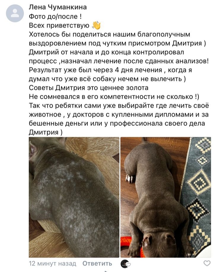 ✨ Очередное чудесное исцеление от Дмитрия История о том, как “неизлечимый атопический дерматит” оказался обычной испорченной флорой Казалось бы, неизлечимый атопический дерматит, «аллергия» — как любят говорить доктора… Но запомните: 👉 99% того, что вам внушают как «аллергию», аллергией НЕ является. 👉 Истинная аллергия — это когда собака раздувается моментально, как будто её ужалила пчела. 👉 Всё остальное: — расчесы — залысины — грязь в ушах — краснота на лапах — пятна и “аллергичные” животы это просто испорченная кожная флора, и она лечится. И, что важно, лечится быстро, если не бегать по кругу, не менять 10 кормов, не сажать собаку на апоквел, преднивет и особенно на циклоспорины, как советуют «специалисты» На фото — очередной результат того, что действительно работает. Человек уже не верил, что собаку можно вывести. Но схема, которой я поделился, после сдачи анализа которого я подсказал, дала эффект уже через 3–4 дня. 🎁 АКЦИЯ При покупке корма + лежанки с бортика