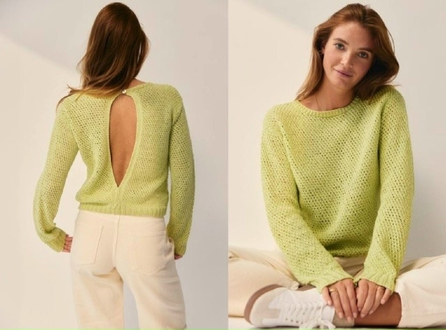 Это описание для вязания легкого женского джемпера (пуловера) укороченной длины (кроп-топ), выполненного ажурным узором ("дырочками") в ярко-салатовом (или зелено-желтом) цвете. Главной дизайнерской особенностью является глубокий вырез-капля на спине, который фиксируется одной пуговицей у горловины. Для вязания потребуются прямые спицы № 3.5, № 4, № 5 и круговые спицы № 3.5, № 5.