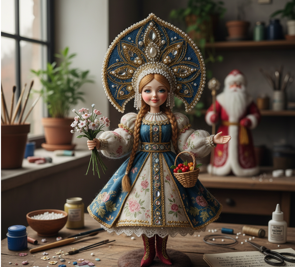 Цветы и букеты: Нежные ватные розы, тюльпаны или веточки папоротника в руках персонажа добавляют ему романтичности, праздничности или загадочности.