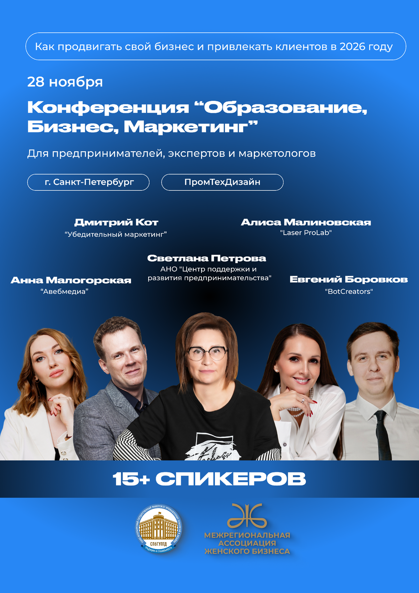 Офлайн-Конференция «Образование. Бизнес. Маркетинг» 28 ноября |📍 г. Санкт-Петербург, Университет «ПромТехДизайн», ул. Большая Морская, 18 Если вы чувствуете, что бизнес требует новых решений, а старые подходы больше не работают — это событие для вас. Здесь говорят не о «громких запусках», а о том, как компании действительно растут: • какие стратегии помогают предпринимателям и маркетологам адаптироваться к рынку; • как находить клиентов и укреплять доверие без пустого шума; • что помогает увеличить эффективность и прибыль, не раздувая бюджеты. В программе — 16 экспертов из бизнеса, маркетинга и образования. Один из спикеров вице-президент МА Женского Бизнеса- Светлана Валерьевна Петрова. Они поделятся практиками, которые уже дают результат. По итогам — сертификат участника или удостоверение о повышении квалификации государственного образца. Регистрация открыта 👉 http://spbmarketingconf.ru 📍 Конференция проходит на базе университета «ПромТехДизайн»
