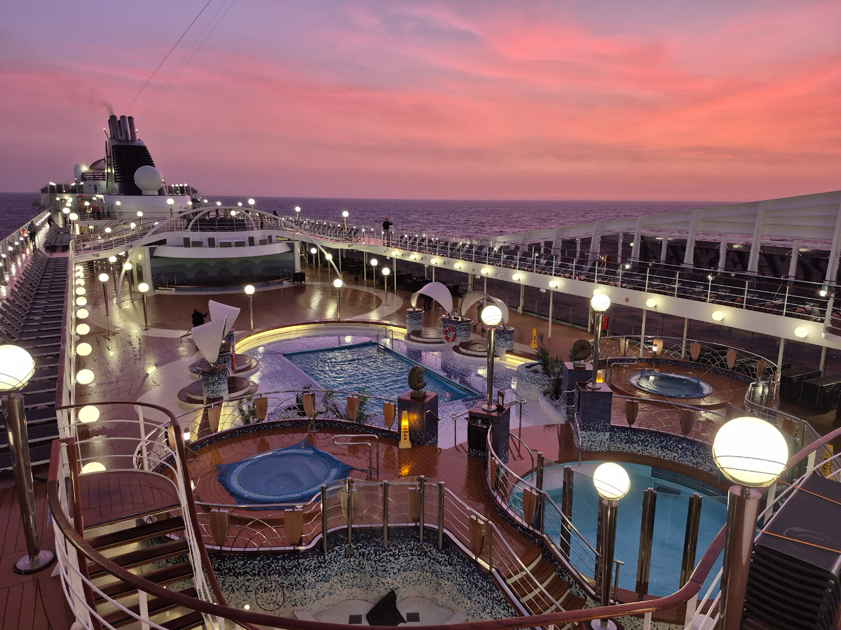 Как правило, в круизах бывает день в море. Иногда один, иногда два, иногда больше. Например, в круизе из Кейптауна в Дубай будет аж двенадцать дней в море. Вчера у нас был такой день : день в море. Утром встали и побежали смотреть, как солнце всходит. Красиво! Небо становится светлее, светлее... Облака розовеют. Стоим на верхней палубе, ждем. Ждем, когда появится первый луч из-за горизонта, появится краешек солнечного диска. Для меня это какое-то завораживающее действие. Нам повезло: небо было чистым и восход мы увидели! Долго стоять на открытой палубе помешал ветер: сильный, порывистый. Но не холодный. Так что самый волнующий момент я увидела через стекло, спряталась от ветра в буфете. Небольшую физкультуру перед завтраком отменить нельзя, не смотря на ветер. Так что по палубе быстрым шагом три круга все-таки сделала. Саша отказался, пошел выбирать себе завтрак. Что будем делать? Посмотрели программу на день: много всего. Два урока танцев, какие-то спортивные развлечения, в