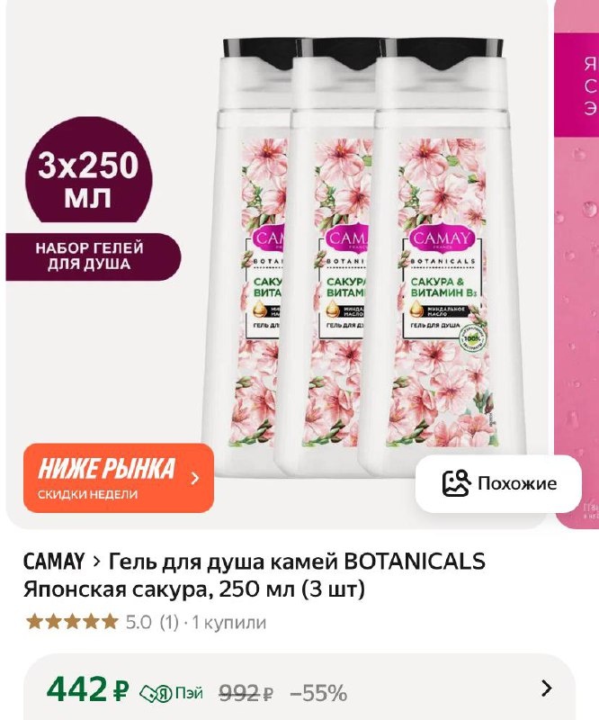 Гель для душа камей BOTANICALS Японская сакура, 250 мл (3 шт) https://market.yandex.ru/cc/82gPm4 ⭐️NORTME-41-AF - минус 2000₽ на один любой заказа от 8000₽ (для новых пользователей) ⭐️BER103-AF — минус 100₽ на один любой заказ от 5000₽ ✅ Подписаться 🔣 Бот с промокодами