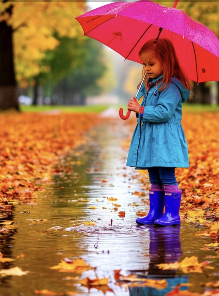 🍂Сказка про осенний зонтик и сапоги В одном доме жили три друга: маленькая девочка по имени Оля, красивый разноцветный зонтик и пара ярких резиновых сапог. Они часто играли вместе, гуляли по лужам и радовались осени. Однажды утром погода была особенно промозглой и сырой. Дождь шел стеной, ветер завывал, листья кружились по улице. Мама сказала Оле: — Сегодня придется остаться дома, дорогая моя. Очень уж плохая погода. Но Оля расстроенно вздохнула: — Мне хочется погулять, посмотреть на красивые лужи... Тогда её верный зонтик решил подбодрить девочку: — Ничего страшного, милая Олечка! Возьми меня с собой, и никакой дождь нам не страшен! Рядом лежащие сапоги обиделись: — Что значит "ничего"? Мы тоже хотим пойти с тобой! Если замерзнешь, будешь плакать и болеть. Оля улыбнулась друзьям: — Но ведь вас обоих надо брать... Как же иначе-то? Зонтик нахмурился и повернулся к сапогам: — Это я полезнее! Я укрою нашу маленькую хозяюшку от непогоды, не дам ей простудиться! Сапоги сердит