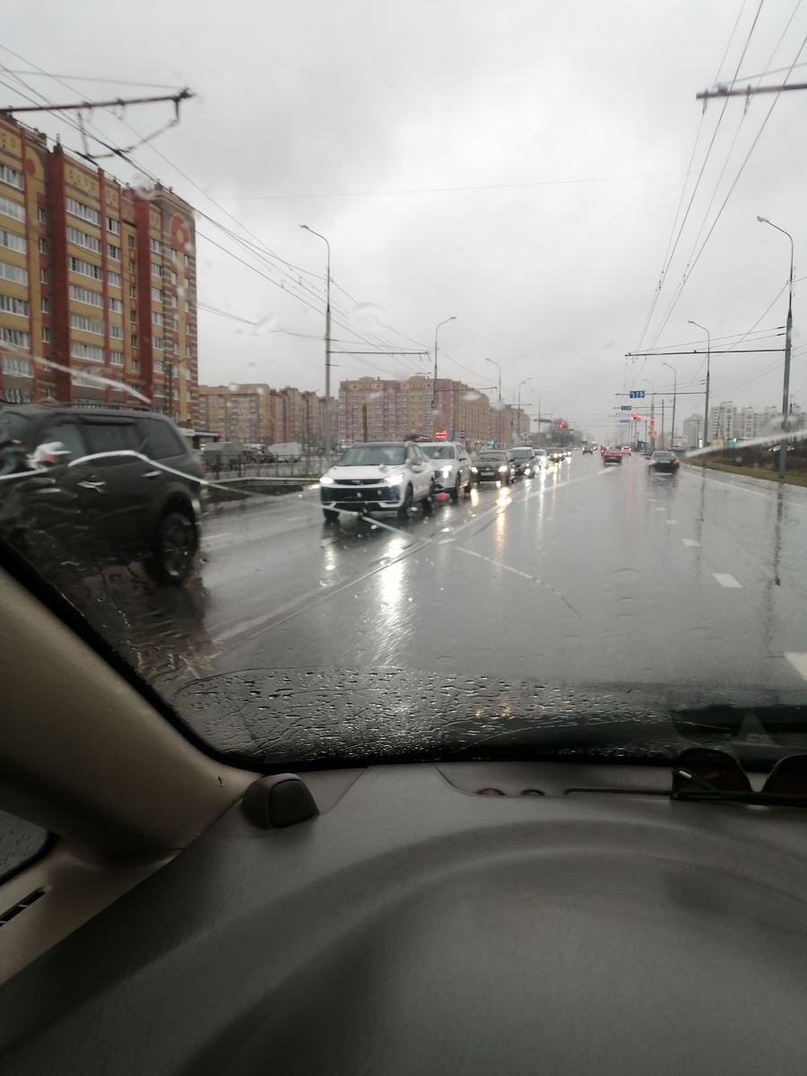 Дождина такой, светофор на выезде из Финской деревни, не работает.