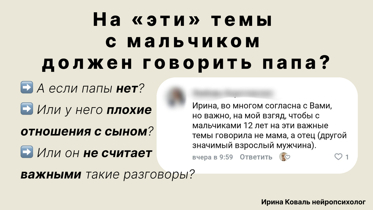 «Важно, чтобы с мальчиками 12 лет на эти важные темы говорила не мама, а отец или другой значимый взрослый мужчина», - такой комментарий появился под постом про мастурбацию. Это мнение достаточно популярно: с мальчиками должны говорить мужчины - папы, старшие братья, дяди и так далее. С девочками, соответственно, мамы, бабушки и тети. Этот принцип вполне адекватный, если рядом с мальчиком есть взрослый мужчина, который: - Сам вырос в здоровой атмосфере и легко говорит на «эти» темы - Имеет близкие, доверительные отношения с ребенком - Готов выделить время и эмоциональные силы для таких бесед. Ну то есть это супер идеальная ситуация, как вы видите. ❓Что я вижу в реальности? «У нас папа работает в две смены, сын его почти не видит...» «Сын стесняется отца, они не так близки...» «Я воспитываю сына одна с трех лет...» «Мой муж не знает, о чем говорить...» И нет рядом мужчин, которые разделяли бы мамино желание дать сыну в семье важные знания до того, как он узнает об этом от одноклассником