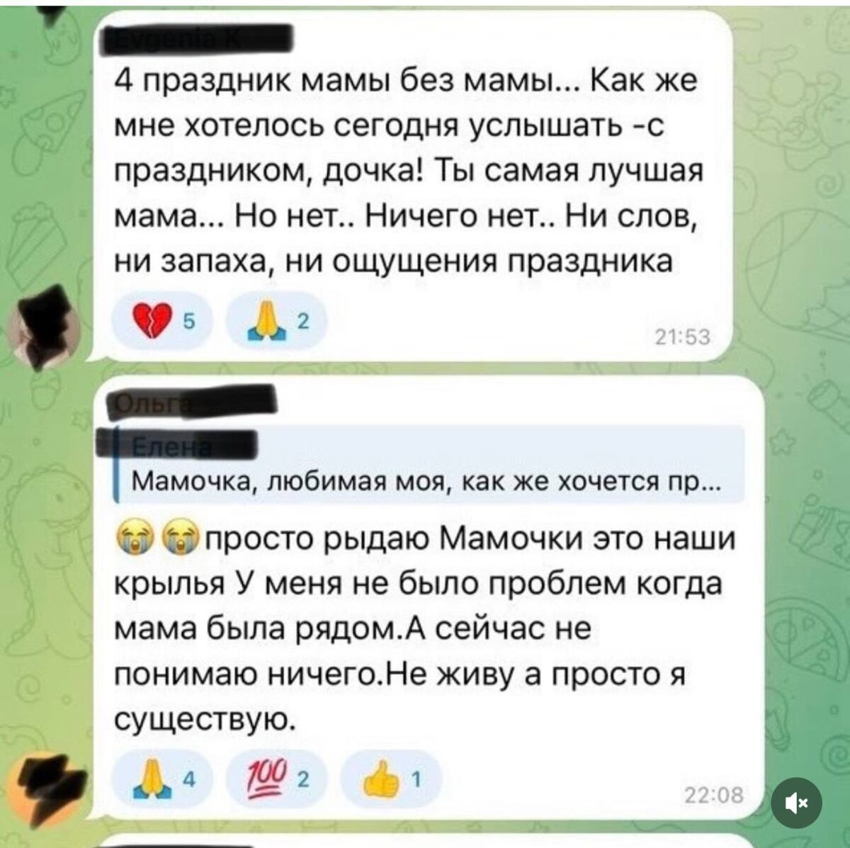 Это скрин из группы для людей, переживших горе. Очень больно физически находиться в этой группе. Я не смогла и 10 минут. Да, всем горюющим нужна помощь, и, наверное, создатель данного пространства хотел именно этого для людей (хочу верить в это). Только, к сожалению, упустил одну правду жизни. Такие группы «помощи» цементируют горе! Процесс горевания заложен в нас от природы и должен проживаться для адаптации после утраты. Проживаться! Эмоция за эмоцией, состояние за состоянием. С откатами и прорывами вперёд. Но всегда с движением — чтобы жить. А не закрепляться благодаря такому бесконечному плачу. И ведь никто там не скажет, что если вы 4 года плачете по маме, то у вас уже 2 года — патология горя, вы уже вступили на путь саморазрушения. Если я напишу в группу, то можно засекать считаные минуты, через которые меня выкинут из этого сообщества. Ведь это будет противоречить его цели. Только вот этот вселенский плач без профессиональной помощи ничего хорошего не даёт. Так же, как и предлаг