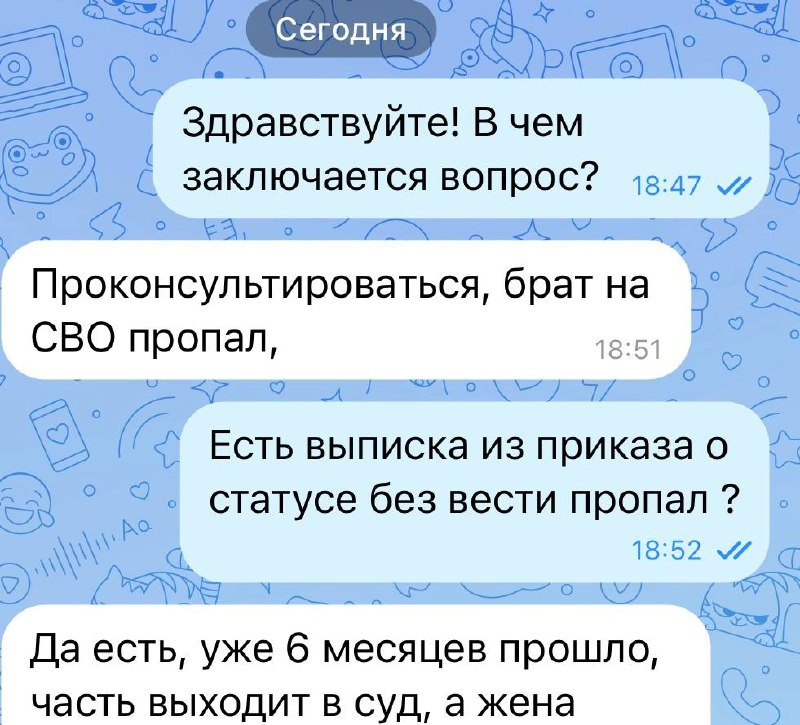 Удивительная вещь, в нашей стране много хороших законов и постановлений, которые казалось бы должны облегчать жизнь людей , а нет, лучше пустить людей через 7 кругов ада, а то наверное им слишком спокойно живётся. Хотя я бы не сказала, что родственникам участников СВО спокойно живётся, тем более когда боец без вести пропал. И вот проходит пол года с объявления бойца без вести пропавшим, в списках пленных он не значится и тут командиры решают инициировать судебный процесс по объявлению бойцов безвестно отсутствующими. И ведь хватает у них времени на подготовку заявления, формирования доказательной базы, направление заявления в суд, участие в суде, а вот на то чтобы выписать справку о смерти у них почему то времени нет. Казалось бы - эта процедур менее времени и трудо затратнее. Постановление Правительства РФ от 1 сентября 2023 г. N 1421 "Об утверждении Правил выдачи справки об обстоятельствах исчезновения гражданина и справки об обстоятельствах исчезновения или возможной гибели граж