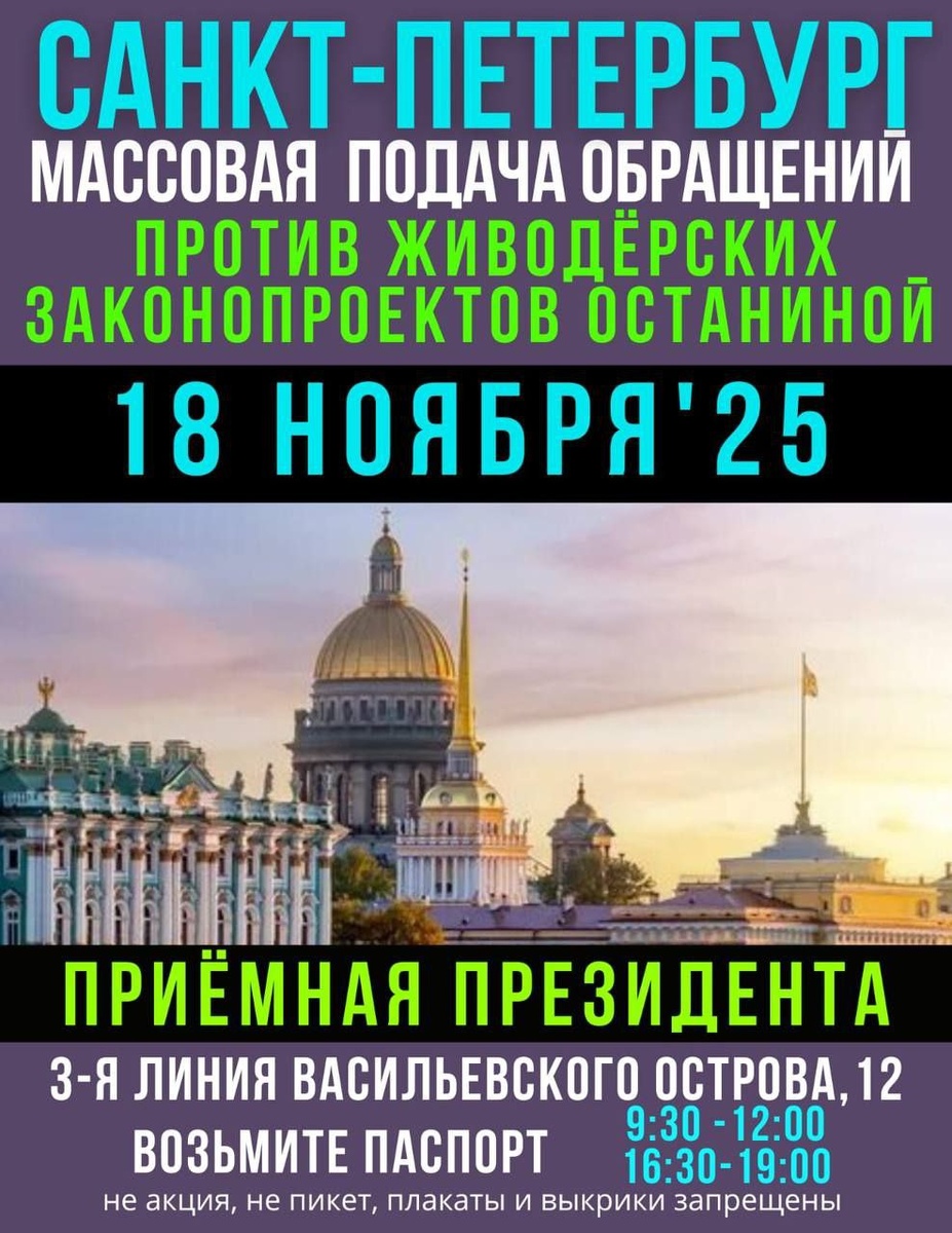 ⚡️⚡️⚡️Санкт-Петербург 18 ноября выходит на подачу обращений Президенту против живодерских законопроектов рабочей группы Останиной
