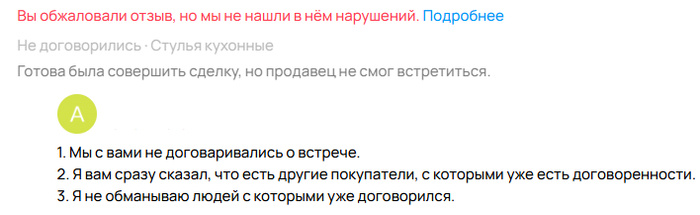 На авито есть целая толпа перекупов, которая чуть-что начинает строчить гневные отзывы. Да, даже если ты с ними лично ни о чем не договаривался. Просто потому, что ты не соизволил их высочеству продать за ту цену, за которую она хотела бы купить. Причем, ты пишешь в саппорт, прикладываешь переписки, но там всегда будет ноль эмоций: "мы проверили, ничего не нашли, все по правилам". А можно я в ответ тоже буду иметь право писать негативные отзывы а-ля:Покупатель клянчил скидку, угрожал, ныл, а когда не получил желаемого накатал целую телегу с выдумками и оскорблениями. Не советую вообще вступать в диалог даже с таким покупателем". Было бы справедливо, но нет: авито все равно. Моя история на тему: распродавал мебель. Причем, как распродавал: до мусорки нести лень было, вот и решил продать, чтобы сами вынесли. Мебель была в хорошем состоянии и большую часть разобрали быстро. Остались пара стульев, на которые тоже были покупатели. Причем, адекватные. Попросили день подождать и они заберут.