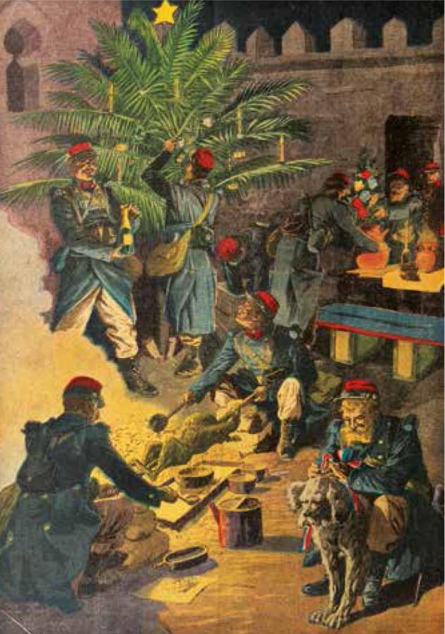 Рождество в Марокко, судя по форме одежды легионеров (знаменитые белые кепи изначально были служебной формой одежды для жаркого климата, уставным отличием Легиона они стали только в 1964 г., так что на картинке солдаты в общевойсковых головных уборах) - до 1914 г.: Период Первой мировой войны, легионеры на Западном фронте: 1938 г.: Период после Второй мировой войны, не совсем понятно когда именно: Несколько вариаций Рождественской открытки на тему службы Легиона на Ближнем Востоке в 1940-е гг., характерна для этого периода форма многих легионеров, основанная на традиционной одежде бедуинских племен, так