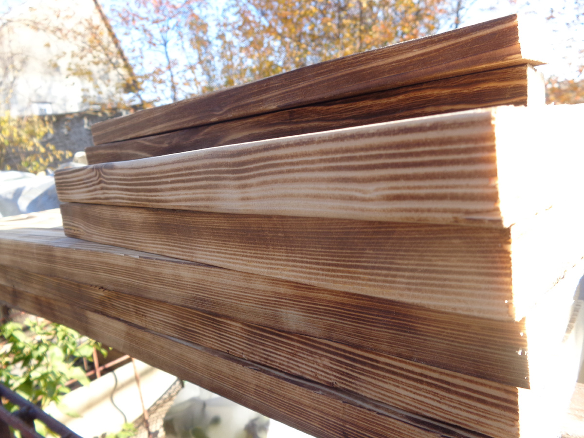 Сегодня предлагаю сделать красивую подвесную полки из небольшого количества материалов. Для начала режем: доски 2шт. размером 50 на 15 см., 2 планки размером 32 на 15см., 3 планки размером 32 на 4 см. Планки декорируем методом «Браширования». Для этого доску обжигаем до черноты, а затем проходимся вдоль щеткой по металлу, пока древесина приобретёт рельефную поверхность. Собираем полку, чередуя, планка – доска. Теперь финиш. Закругляем острые углы, покрываем тонированным маслом, ждем высыхания, затем покрываем прозрачным маслом в 2 слоя, каждый слой сохнет от суток о 3 суток. Вешаем на стену с помощью мебельных подвесов. И пользуемся. П.с. полку можно поставить на письменный стол, тумбу и т.п.