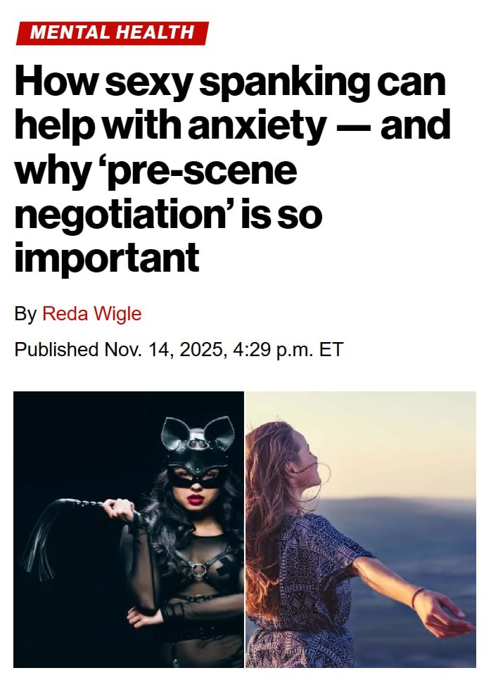 БДСМ-практики помогают снижать тревожность и справляться со стрессом — показывает исследование. Контролируемая боль и игра со властью способствуют концентрации на ощущениях и вызывают выброс эндорфинов и дофамина. В результате люди расслабляются и эмоционально высвобождаются. • Сексуальное возбуждение во время причинения боли действует как анальгетик и изменяет уровни дофамина и окситоцина. • Для людей с тревожностью важным аспектом становится контроль. • Исследование 2016 года подтверждает, что БДСМ-практики способствуют снижению психологического стресса. Ключевой фактор для положительного эффекта — предварительное обсуждение, договоренности о границах, техниках, стоп-словах и взаимных ожиданиях. Бесплатный GPT-bot ⚡️НейроМастер⚡️