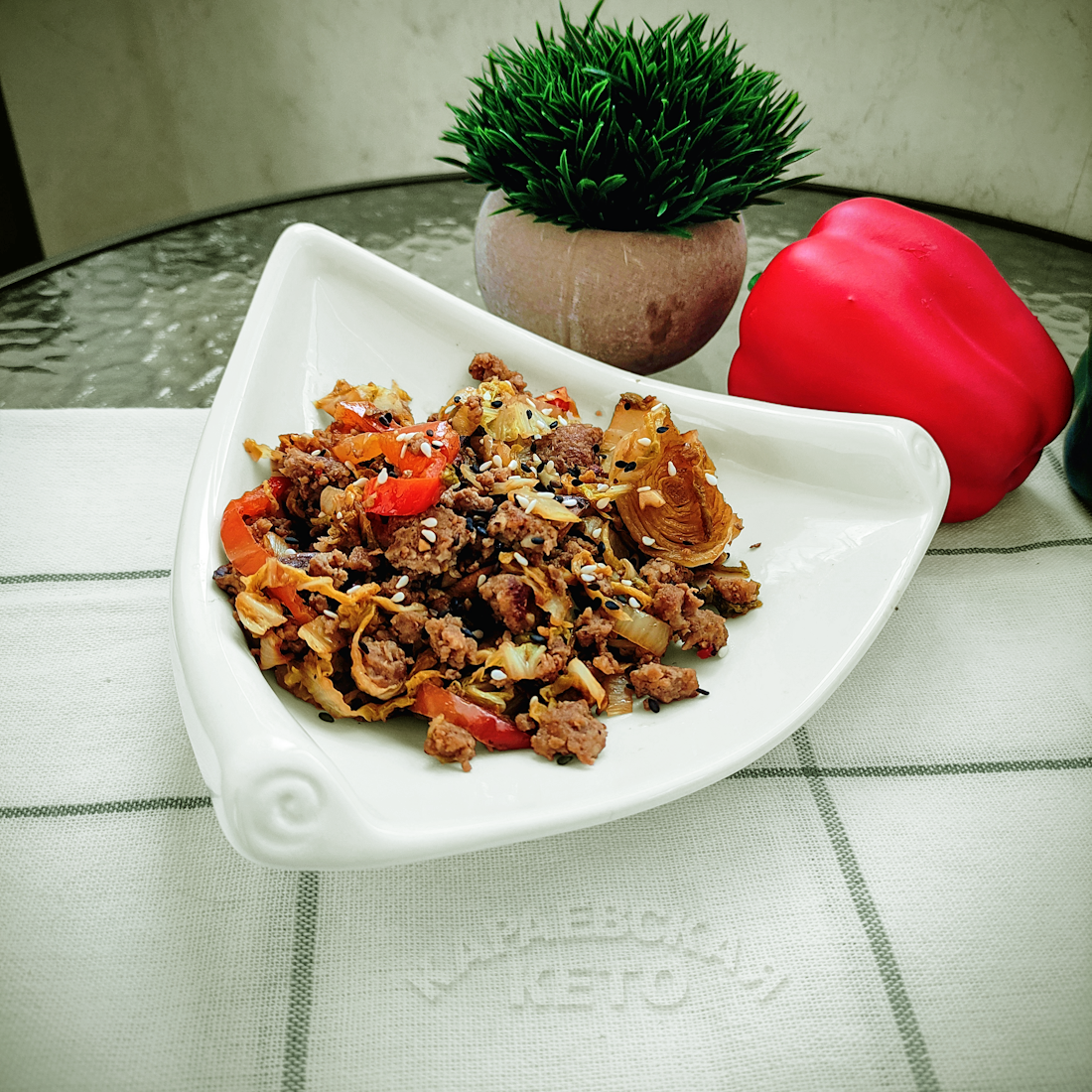 Фарш полностью заправить солью, перцем, луком и яйцом. 2. На разогретую сковороду с маслом выложить фарш и начинать обжаривать не среднем огне до слегка румяной корочки, разбивая комочки фарша, добавляя имбирь, чеснок. Жарить примерно минут 5. 3. Выложить фарш и в эту сковороду положить грибы. Тушить пару-тройки минут и добавить капусту и болгарский перец. Черех пару минут влить яблочный уксус