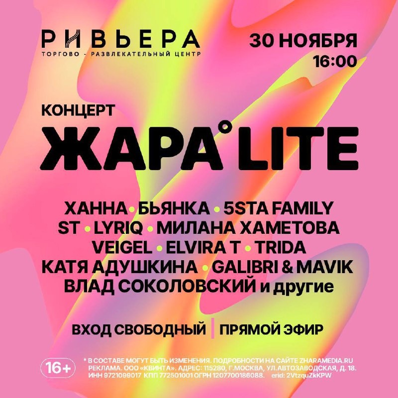 30 ноября в 16:00 состоится концерт ЖАРА LITE, который пройдет в ТРЦ РИВЬЕРА 😎 На сцене вы сможете увидеть выступления следующих артистов: Ханна, Бьянка, ST, 5sta Family, LYRIQ, Милана Хаметова, VEIGEL, Elvira T, Катя Адушкина, Galibri & Mavik, Влад Соколовский, TRIDA и многие другие Вход свободный! Состав артистов может меняться Кого из артистов будете ждать больше всего? ☺️