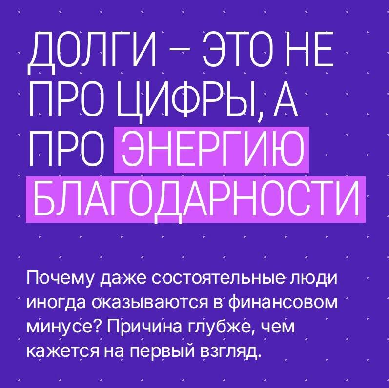 Знакомо чувство, что деньги утекают сквозь пальцы, а долги висят тяжёлым грузом, как будто ничто не может их закрыть? Что если проблема не в сумме в банковском приложении, а в чем-то гораздо более глубоком? 👉 Долг — это не про деньги. Это про обмен, который не завершён. Когда ты что-то получаешь (деньги, помощь, опыт) и не проживаешь искреннюю благодарность, энергия застывает между «взял» и «отдал». Ей некуда течь, и тогда она ищет физическую форму, чтобы напомнить о себе — через счёт, штраф или внезапные расходы. Не цифры формируют минус, а внутреннее ощущение «я всё ещё должен». 💫 Мир никогда не наказывает. Он просто балансирует потоки. Если ты живёшь с чувством долга, твоё поле подстраивается — появляются кредиты, зависимости, вечное «не хватает». Но стоит признать и принять всё полученное (даже боль и уроки), как система замыкается. Ощущение завершённости стирает финансовый минус быстрее, чем любые выплаты. Деньги возвращаются туда, где есть тишина и принятие, а не вина и напр