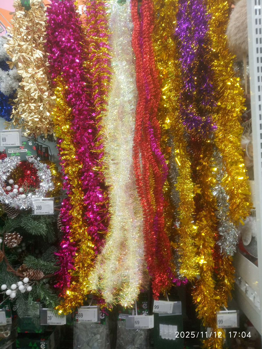 Когда мы зашли в магазин "Ещё", то первым делом я сфотографировал мишуру.