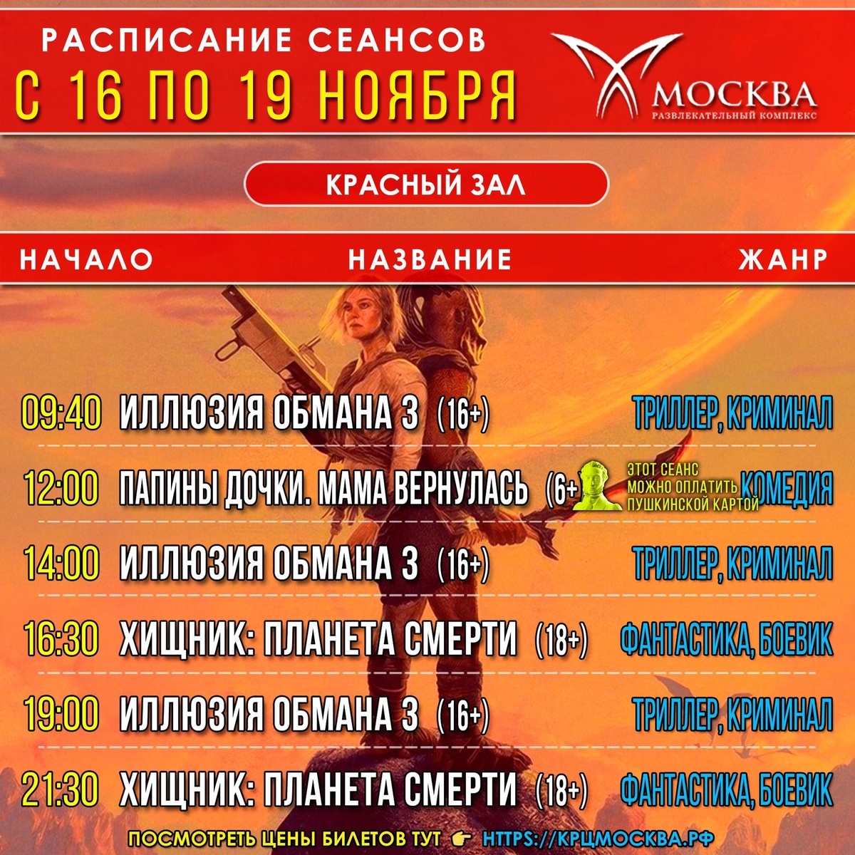 #расписание_сеансов с 16 по 19 ноября «Папины дочки. Мама вернулась» и «Горыныч» можно оплатить Пушкинской картой 💳 Посмотреть цену и купить билеты онлайн можно на нашем сайте https://крцмосква.рф/ и в приложении Google Play и App Store «Кинотеатр Москва, г. Каспийск» ▰▰▰▰▰▰▰▰▰▰▰▰▰▰▰▰▰ #купитьбилет #афиша #смотритевкино #крцмосква #каспийск #ценабилетов #кино #фильм #cinema #kaspiysk