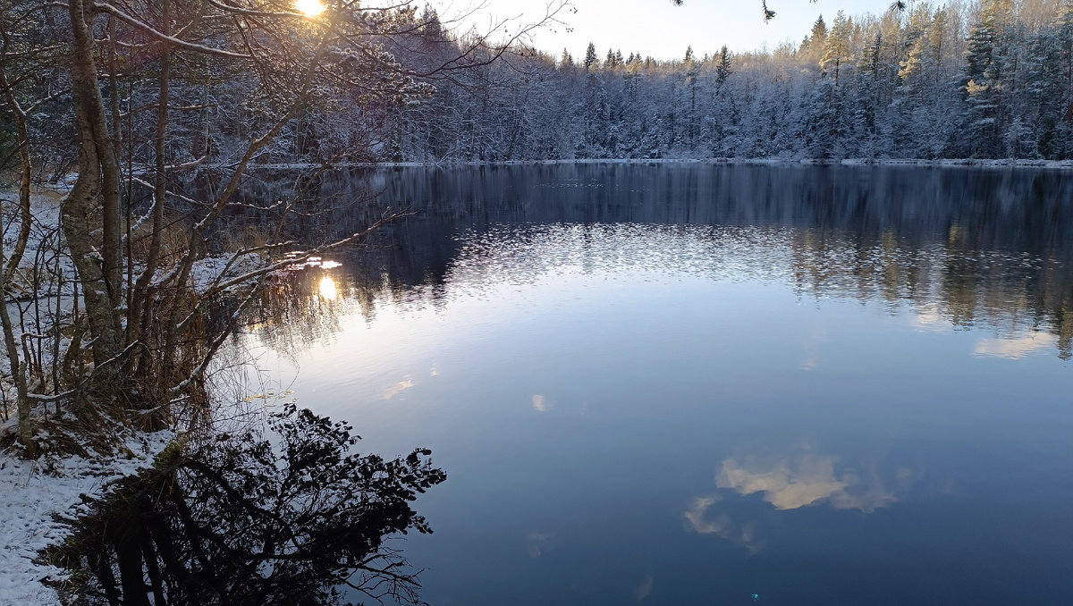 Сегодня утром мир изменился. Ночью подморозило, а к рассвету землю укрыло первым, тонким, но уверенным слоем снега. Эта звенящая тишина и белизна всегда действуют на меня магически. В голове щелкнул тумблер: «Надо идти!». Была слабая надежда, что заморозки сковали лесные тропы, и я смогу наконец-то пробиться к озеру для разведки. Быстро собрался, свистнул Джека, который от радости чуть не снес меня с крыльца, и мы двинулись в путь. Поход оказался настоящим испытанием. Снег был коварной декорацией, под которой скрывалась незамёрзшая, чавкающая грязь. Каждый шаг давался с трудом, ноги вязли в ледяной жиже. Но отступать я был не намерен. Из чистого упрямства, злой и по колено в грязи, я шел вперед. И мы дошли! Спустя почти два часа мы с Джеком, вымотанные и перепачканные, вывалились из леса на берег Лейтимо-ярви. Картина была завораживающая: абсолютно белый, нетронутый снег на берегу и зловещая, темная вода, лишь у самой кромки прихваченная тонкой корочкой льда. Пока переводил дух, я