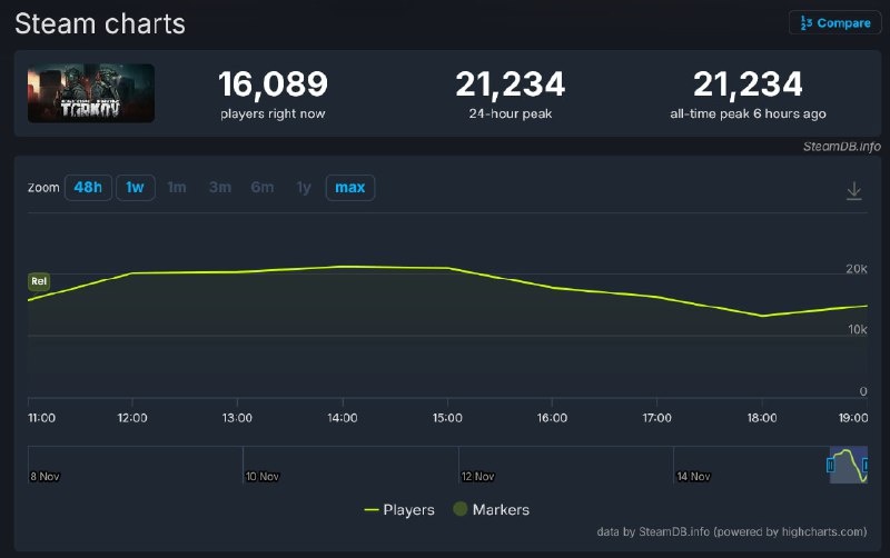 Спустя больше восьми часов после релиза Тарков наконец начал впускать игроков в игру. Пиковый онлайн первого дня в Steam — всего 21 тысяча. До ARC Raiders ещё как до Луны. Подробнее: https://hard-tm.su/threads/127870/ 🕹HARD-TM — Подписаться