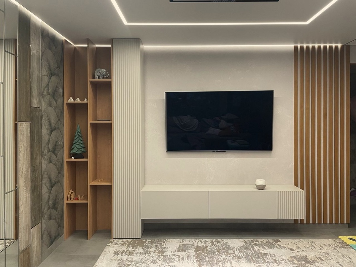 Тв зона. Материалы и дизайн подбирали так, чтобы максимально незаметно и гармонично вписать ее в существующий интерьер. Однотонный декор в оттенок стен, дерево - в тон деревянным рейкам справа. Вертикальные линии открытого стеллажа и рифленых фасадов повторяют рейки и зеркальную плитку на стене. Подсветка расположена как бы с внутренней стороны стоек стеллажа, поэтому не бьет в глаза, врезной короб светодиодки не виден. #тЫквинЛес #гостиная #мебель