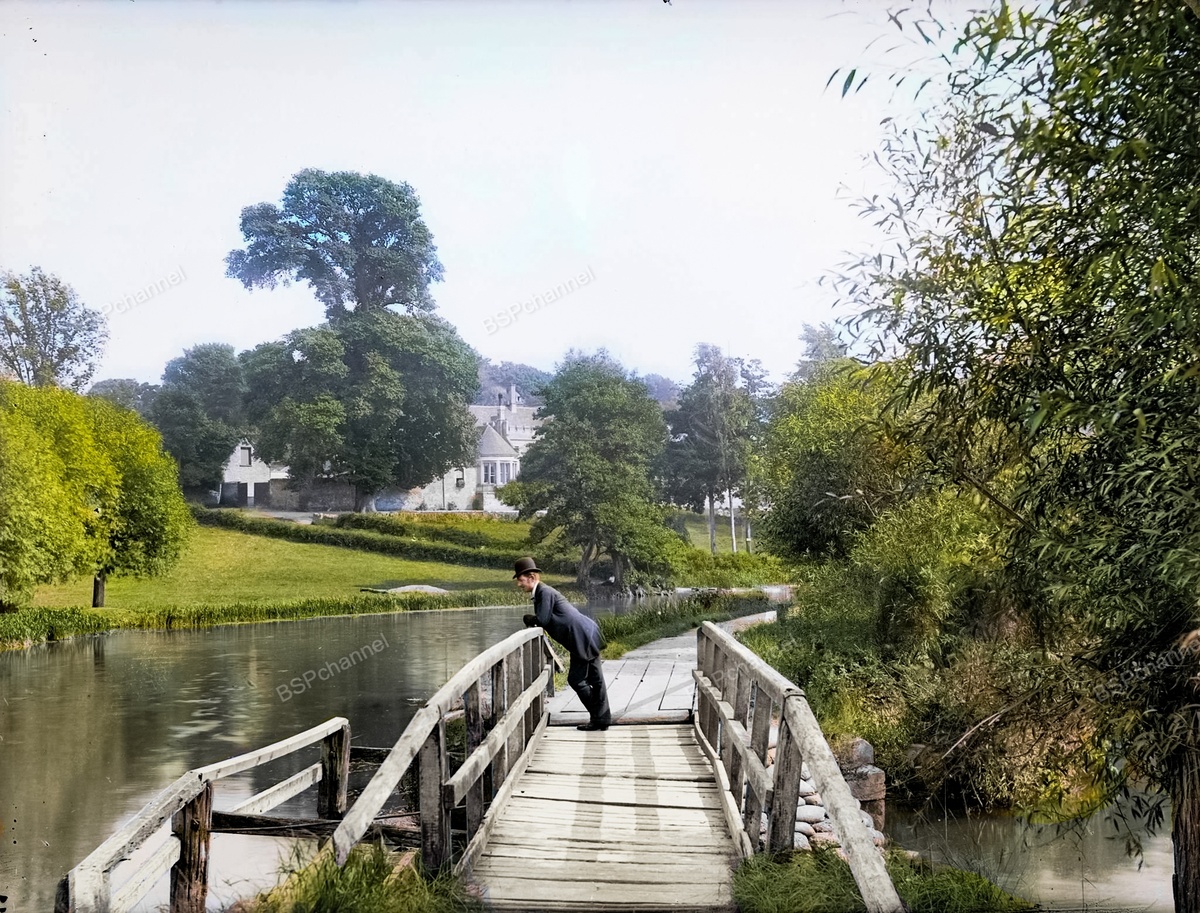 Мужчина опирается на перила пешеходного моста, Иффли, Оксфорд, Оксфордшир, 1885 год.