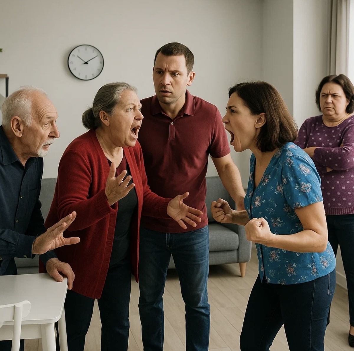 Юра сидел на диване, уткнувшись в телефон. Плечи его были напряжены, челюсть сжата. Он делал вид, что не слышит перепалки, хотя каждое слово било по нервам, как молотком по стеклу.