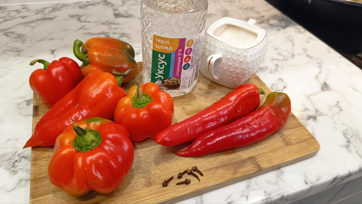- Сахар - 500 гр. 1. Сладкий и острый перец вымыть, очистить от зернышек. Нарезать соломкой. 2. Выложить в кастрюлю слой перцев, далее — слой сахара, и повторять до завершения продуктов. Оставить всё на 2-3 часа для выделения сока.