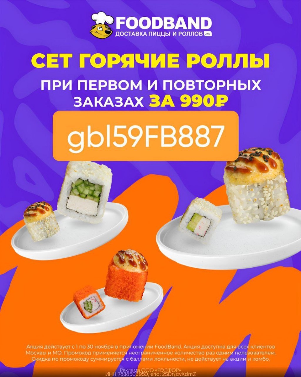 🔤FOODBAND🔤 🍕🍱 ОНЛАЙН ДОСТАВКА ПИЦЦЫ И РОЛЛОВ 24 ЧАСА 🔥PROMOCODE🔥 ⭐️gbl59FB887 📣СЕТ ГОРЯЧИЕ РОЛЛЫ ЗА 990₽ в FoodBand 🤩 Заказывайте по ссылке: 🔗https://gtblg.ru/ojzrLI Применяйте промокод — gbl59FB887 Круглосуточная доставка от 25 минут! ❗️Действует на любой заказ на сайте и в приложении. Скидка по промокоду суммируется с баллами лояльности, не действует на акции и комбо. Акция для Москвы и МО. Реклама. ООО «РЭДФОР» ИНН: 7838503950