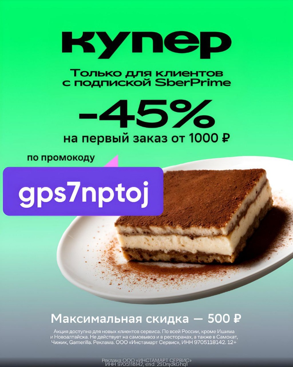⭐️ПРОМОКОД⭐️ 🔤КУПЕР🔤 🛒ОНЛАЙН СУПЕРМАРКЕТ 🛍СКИДКА 45% НА ПЕРВЫЙ ЗАКАЗ ОТ 1000 РУБЛЕЙ 🔥ПРОМОКОД🔥 ⭐️gps7nptoj 📣❤️🔥🔥Скидка 45% на первый заказ в Купере! Свежие продукты из любимых магазинов в Купере со скидкой! ⭐️gps7nptoj - скидка 45% на первый заказ от 1000 ₽. Макс. скидка 500 ₽ Только для клиентов с подпиской SberPrime Устанавливайте иконку веб-версии для iOS в приложении браузера по ссылке 🔗https://gtblg.ru/pj953u, подписывайтесь на push-уведомления и будьте в курсе всех акций. ❗️Промокоды суммируются со всеми акциями и скидками на товары! Акция не доступна в Ишиме и Новоалтайске. Не действуют при заказе в ресторане, на самовывоз, в магазинах "Самокат", "Чижик", "Gamerilla". Реклама. ООО "Инстамарт Сервис", ИНН 9705118142