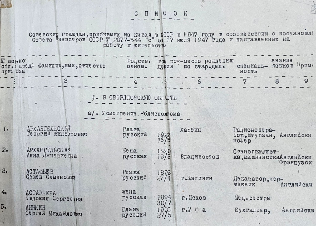 Ссылка доступна в закрытом телеграм-канале с ежемесячной платной подпиской https://t.me/GensledBot Список содержит следующие графы: ✅ Фамилия, имя, отчество ✅ Родств. отнош. ✅ Национальность ✅ Год рождения ✅ Место рождения по стар. дел. ✅ Специальность ✅ Знание языков ✅ Примечание Есть информация в какую область или АССР СССР были направлены на жительство. По многим есть информация на какое именно предприятие были направлены. Во вложении фото одного листа для примера. Список советских граждан, прибывших из Китая в 1947 г. в соответствии с постановлением Совета Министров СССР №2077-544 «с» от 17 июля 1947 г. и направленных н