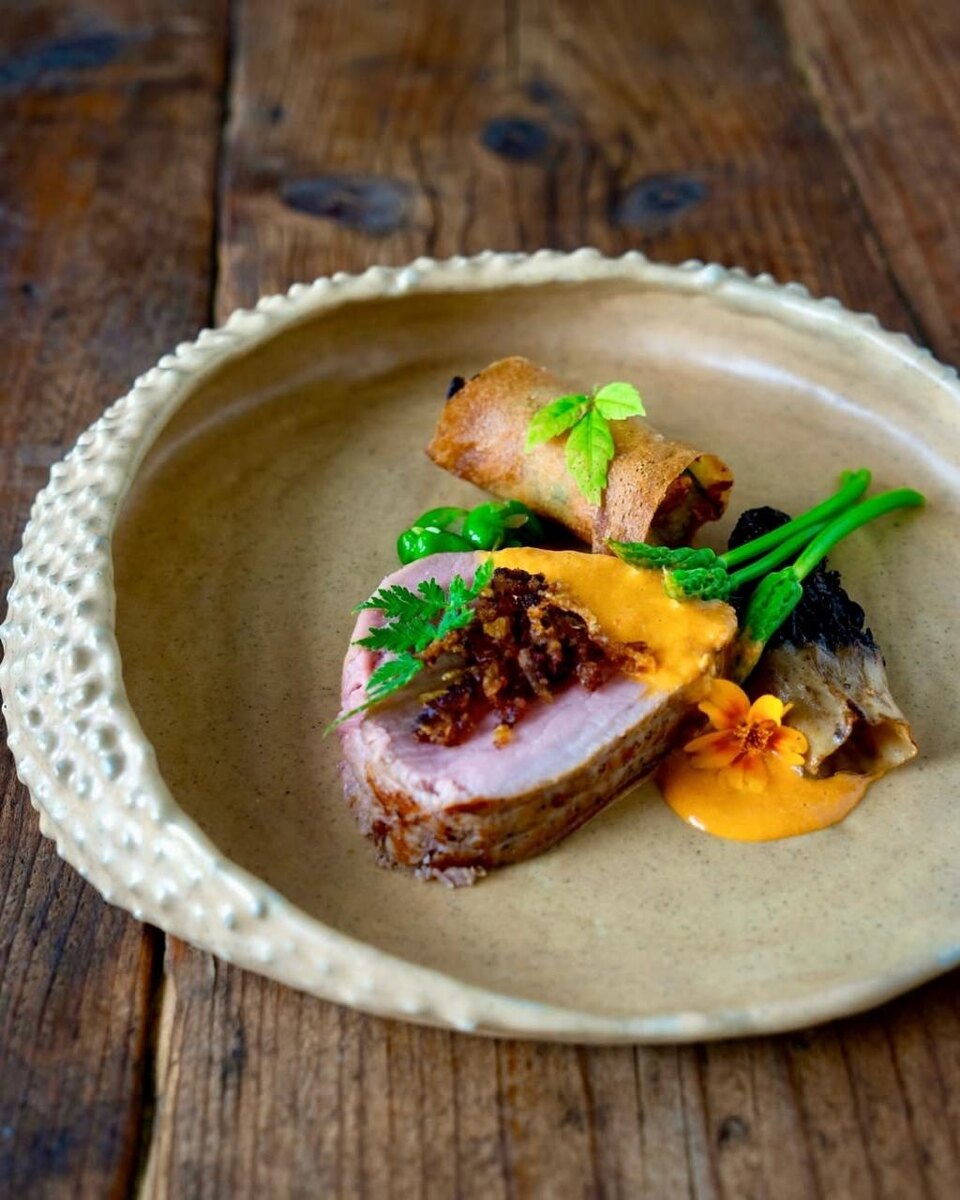 Филе телятины с пеной из паприки, луковой корочкой и картофельными каннеллони