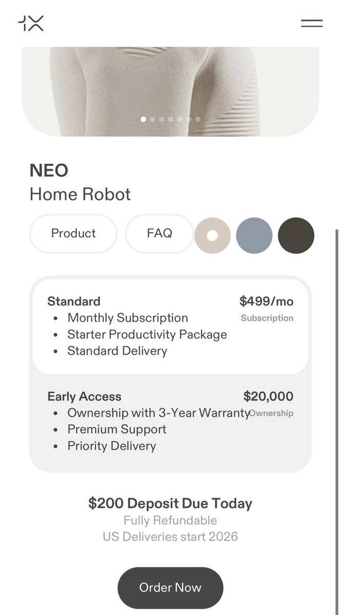 Теперь робота можно заказать домой. Норвежско-американская компания 1х запустили в продажу робота-гуманоида для помощи в домашних делах. Стоит Нео 20 000$ или 499$ по ежемесячной подписке. Будущее действительно рядом, но для этого у вас должны быть 2🍋 для домашнего помощника по мытью посуды и поливу цветов. ❤️/💔?