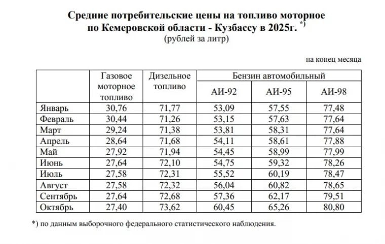 Кемеровостат: за 10 месяцев ощутимо подорожали марки АИ-92 и АИ-95, чуть меньше — АИ-98