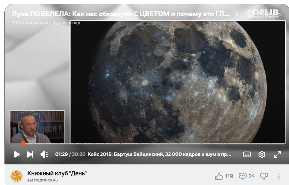 На https://dzen.ru/video/watch/690b3e40e3fbff03012fe522?sid=444612913305611183 известный лунный разоблачитель Роман Голунов выдал ролик о цвете Луны с названием "Луна побелела".