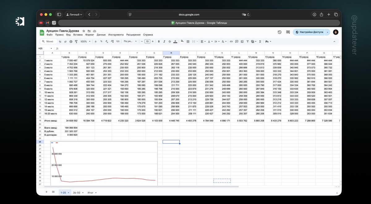 ⚡️⚡️⚡️660 миллионов рублей — столько заработал Павел Дуров за аукцион, прошедший этим вечером Мы посчитали все ставки, за которые на аукционе были куплены и вывели в таблицу. Много интересных цифр вышло — например, в первый и второй раунд пользователи суммарно потратили ~62 млн и 30 млн рублей соответсвенно. Более подробную аналитику можно посмотреть в Google Таблицах. Составили диаграммы и показали динамику цен в каждом раунде. Данные в таблице могут быть неточными. В источнике, откуда мы брали информацию, есть информация только о первых 15 местах, хотя подарок дают топ-20 списка. В силу того, что под конец топ-списка колебания цены минимальные, посчитали ориентировочные значения ставок последних мест. Выручка с аукциона, описанная в заголовке, посчитана с помощью средней цены Telegram Pin, она немного отличается от результата в таблице. ⚡️ Подписаться.