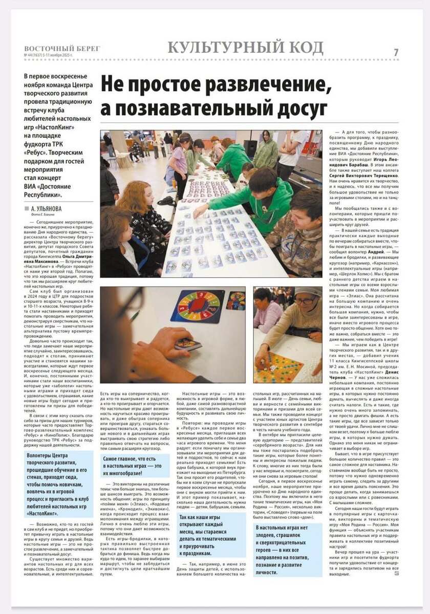 Маркетинговая поддержка ТРК REBUS (фонд «Активо семнадцать») в октябре 🔸 5 октября и 2 ноября, в честь Дня народного единства, провели турнир по настольным играм и вечерний концерт. Мероприятие широко освещалось в СМИ Кингисеппа. 🔸 По воскресеньям проводили творческие мастер-классы для самых маленьких покупателей. 🔸 31 октября поздравили посетителей, пригласив в ТРК самого популярного персонажа этого года — Лабубу. Такие мероприятия повышают уровень лояльности среди покупателей. 🔸 В течение всего месяца готовили и публиковали посты об акциях и скидках, размещали рекламу внутри ТРК. 🔸 Оказали дополнительную поддержку арендаторам — провели фото- и видеосъемку новых коллекций. trk-rebus.ru | VK | Telegram #А17
